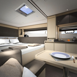 Il centro del è perfetto per trascorrere del tempo in coppia o con gli amici. La colazione, la cena o un piccolo spuntino vengono rapidamente preparati nell'ampio mobile bar completo di piastra di cottura, frigorifero e lavello, e possono essere serviti direttamente al grande tavolo del pozzetto. Flessibile grazie allo schienale ribaltabile del prendisole di poppa, offre uno spazio per un massimo di sei persone.